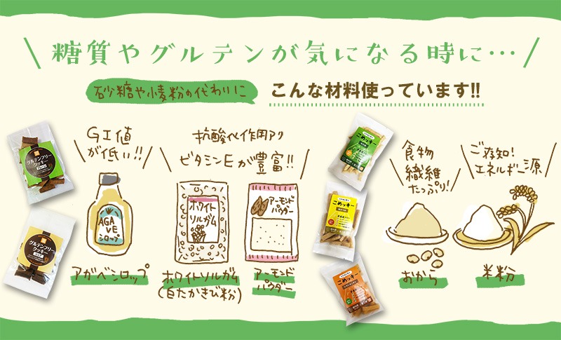 茎工房では、砂糖の代わりにGI値の低いアガベシロップを使い、小麦粉の代わりにたかきびことアーモンドパウダーを使った「グルテンフリークッキー」、シュガーフリー、小麦粉フリーの「こめッキー」で、糖質&グルテンカット生活をしている方を応援しています。